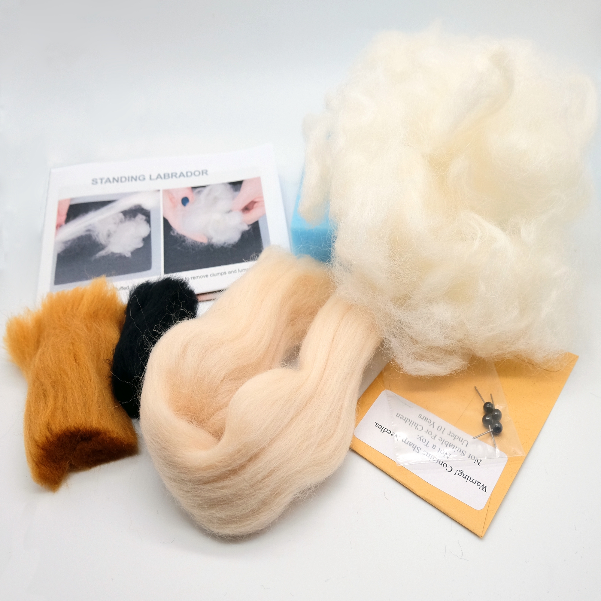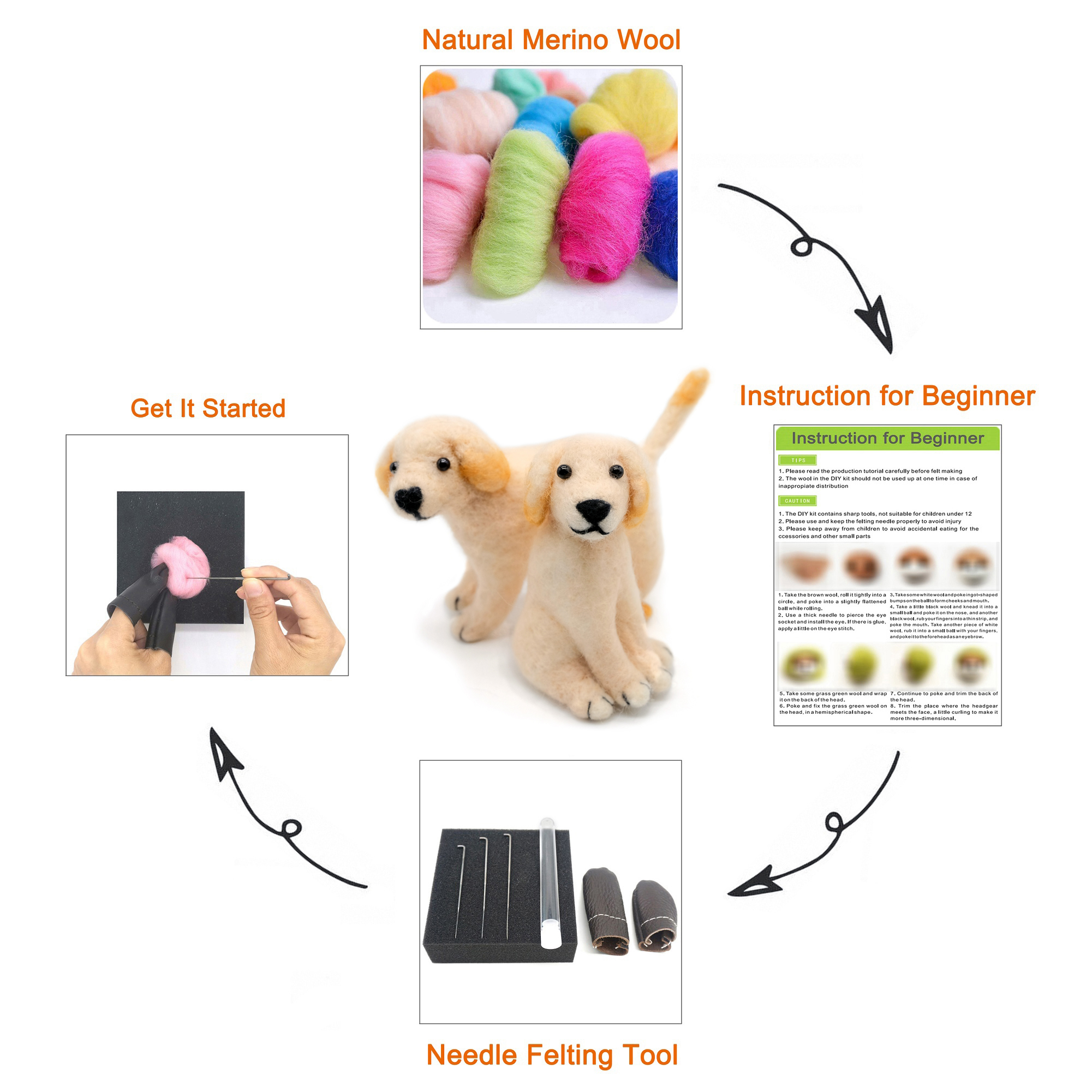 Our animal felting kit comes with full color instructions, enough wool and all the accessories for you to complete.