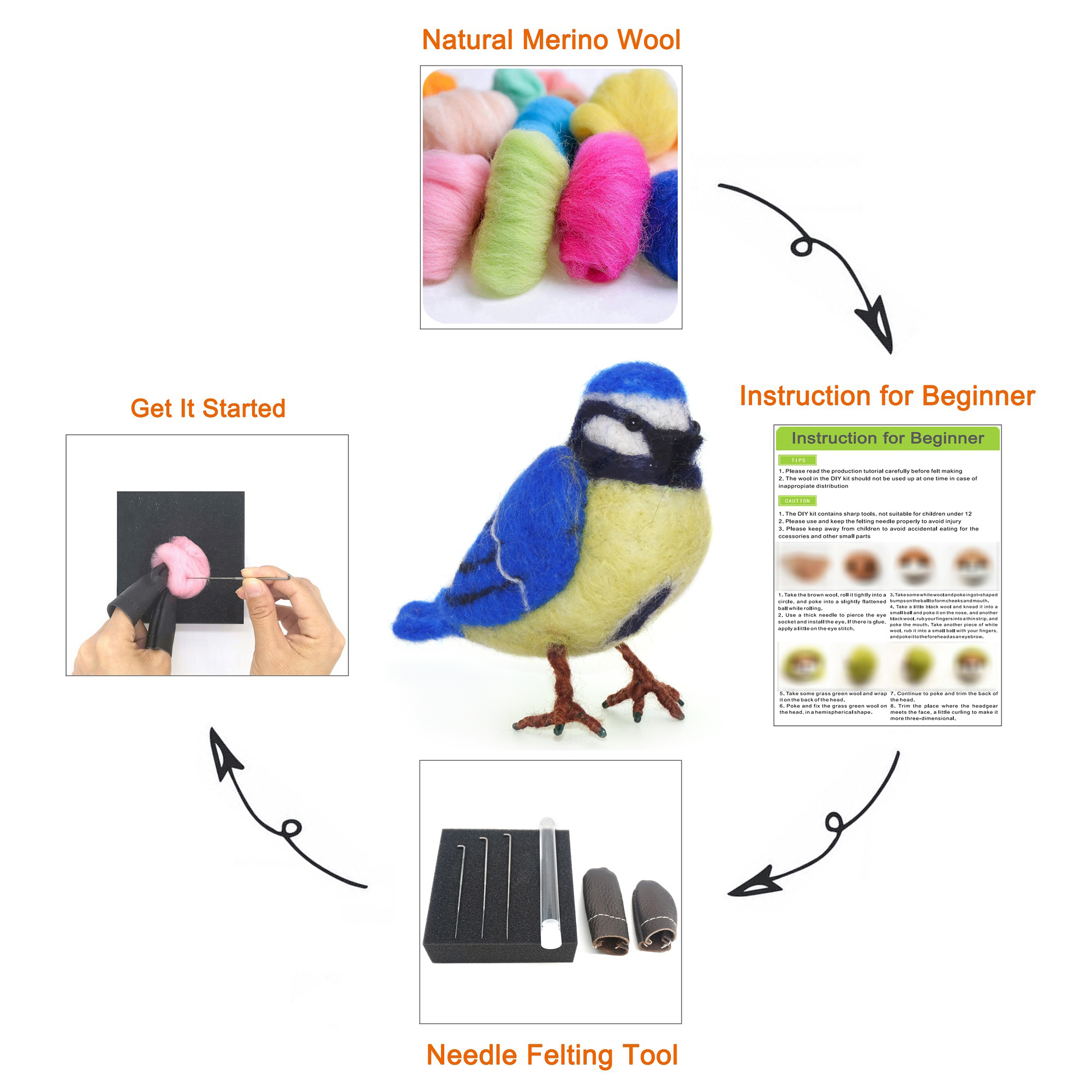 Our animal felting kit comes with full color instructions, enough wool and all the accessories for you to complete.